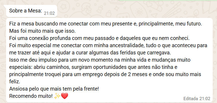 Conecte-se com sua herança ancestral para curar e fortalecer. A Mesa revela influências e energias herdadas, e que podem estar bloqueando seus caminhos. Proporcionando clareza e harmonia, livre de cargas passadas.